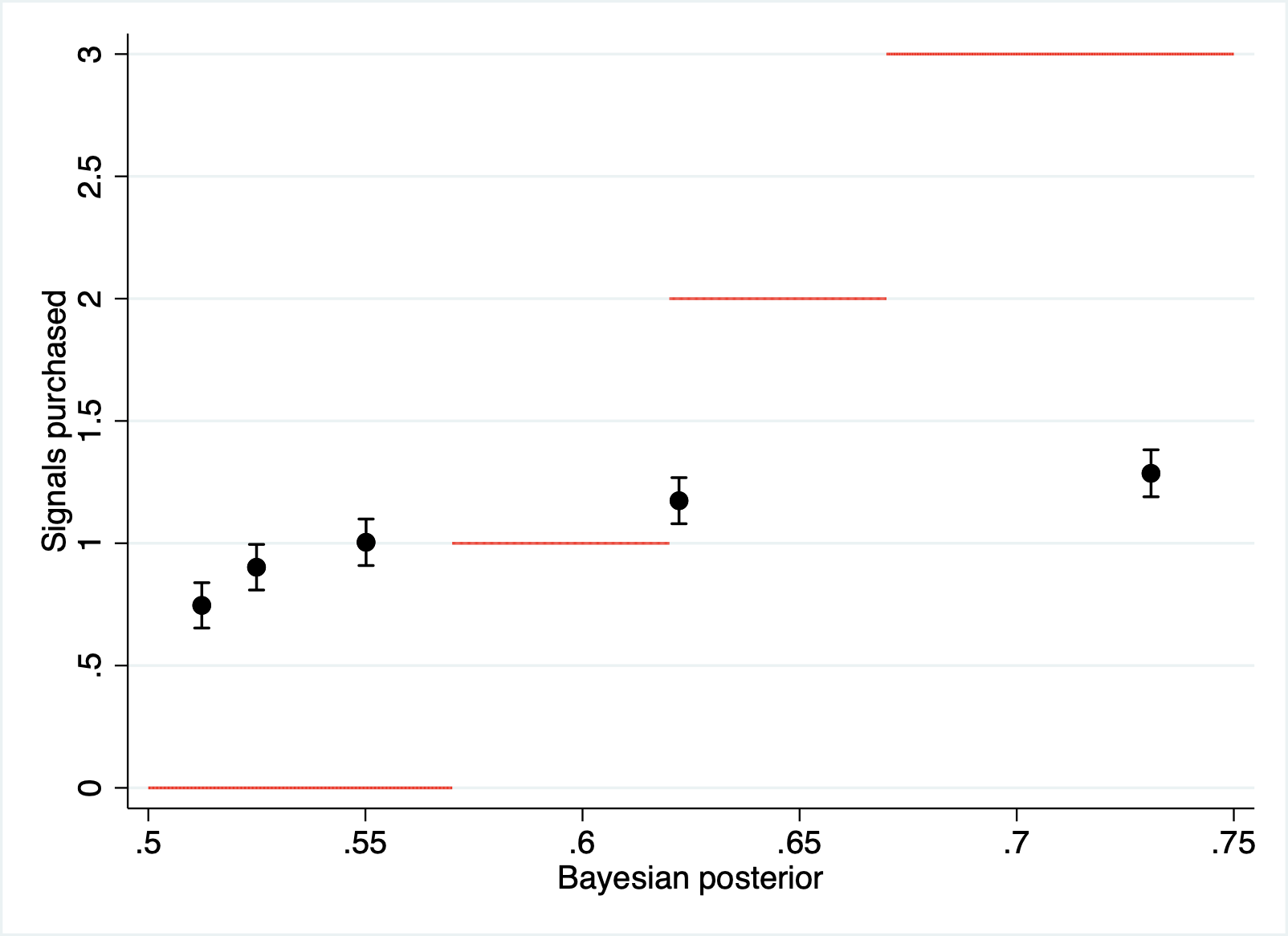 This figure plots the number of signals purchased as a function of signal strength. The red lines correspond to the payoff-maximizing number of signals purchased. This figure shows that subjects over-purchase weak signals and under-purchase strong signals.Â