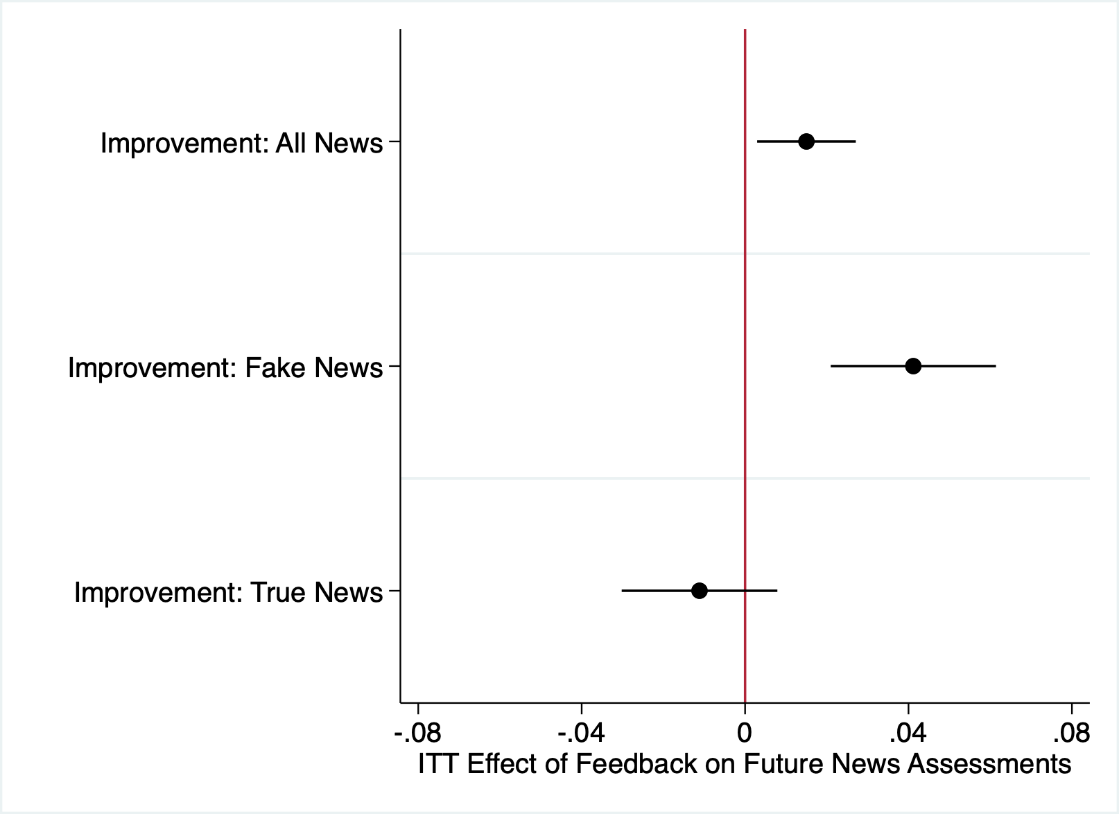 This graph measures the intent-to-treat effect of negative feedback on future news veracity assessments. Coefficients correspond to P(True | True News; Treatment) - P(True | True News; Control) and P(Fake | Fake News; Treatment) - P(Fake | Fake News; Control).