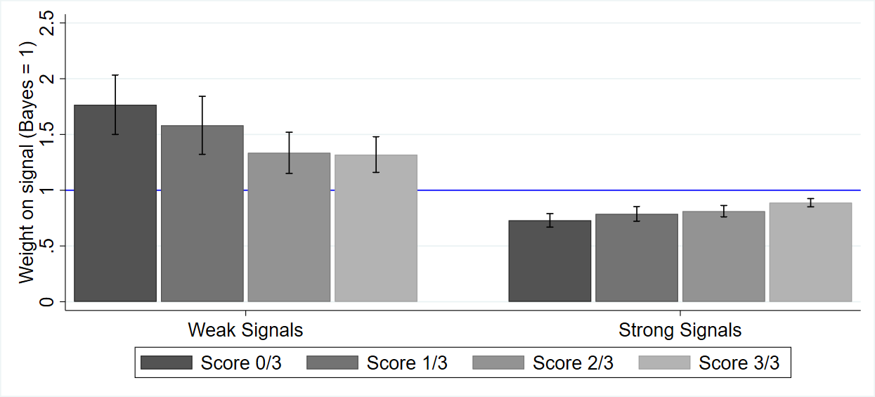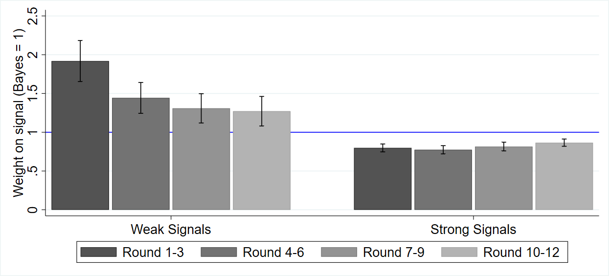 Weak signals have precision between 0.5 and 0.6; strong signals have precision between 0.7 and 1. The y-axis measures how much weight subjects put on the signal, relative to a Bayesian. Values greater than 1 indicate overinference; values less than 1 indicate underinference.