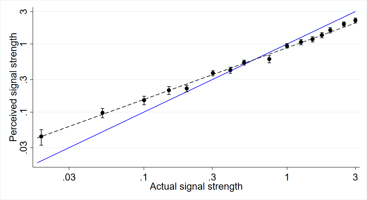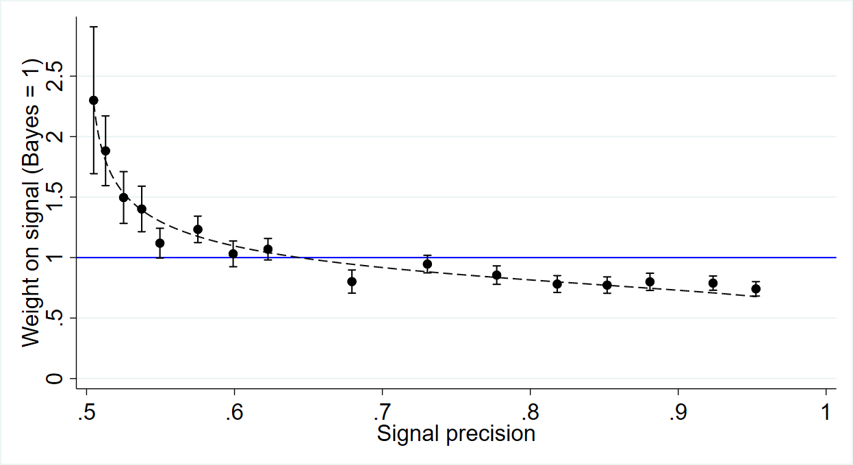 The top panel plots how much subjects over- or underinfer from signals as a function of the true signal. Subjects are given binary symmetric signals of different strengths. The x-axis measures the true signal precision. The y-axis measures how much weight subjects put on the signal, relative to a Bayesian. Values greater than 1 indicate overinference; values less than 1 indicate underinference.