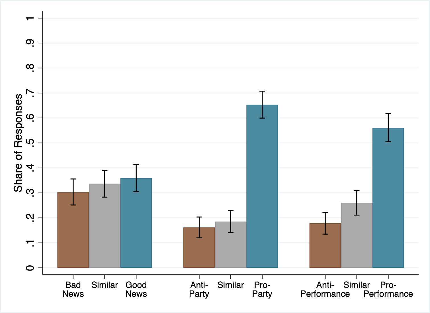 This graph shows the share of respondents that believe people would engage in motivated reasoning in order to trust Good News or Bad News, Pro-Party or Anti-Party news, and Pro-Performance or Anti-Performance news. Respondents are not statistically significantly more likely to predict that people motivatedly reason in Positive directions than in Negative directions, but significant majorities expect motivated reasoning towards Pro-Party and Pro-Performance news.