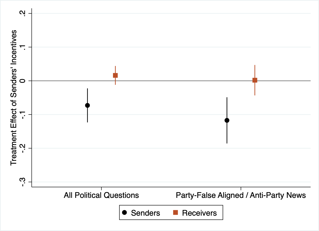 This graph plots the effect of senders being incentivized to be perceived as truthful. The black circles show the treatment effect of sender incentives on the truthfulness of the messages senders choose to send; the orange squares show the treatment effect on receivers' assessments.