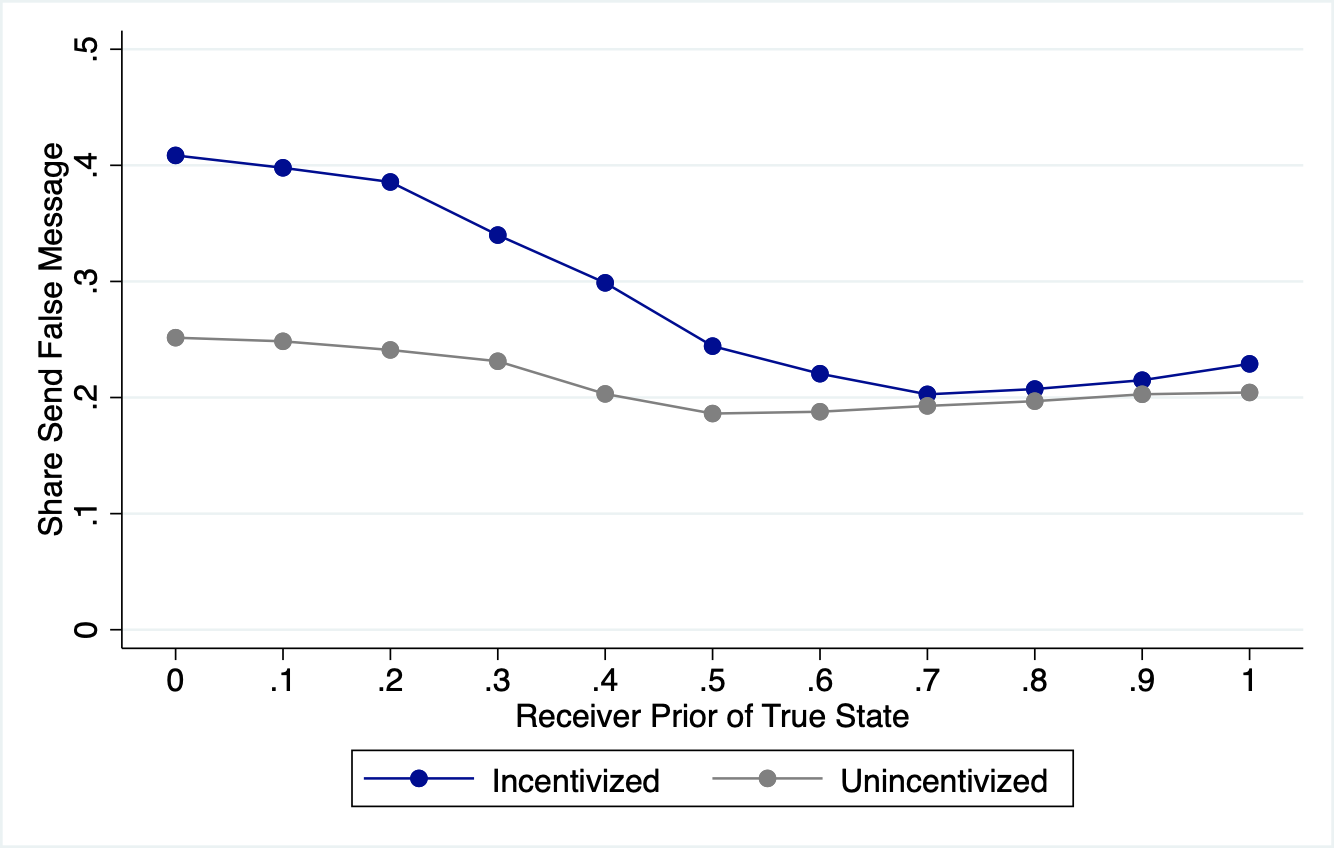 The results show that senders send more false information when incentivized, and that this effect is driven by the fact that they are sensitive to the receiver's prior.