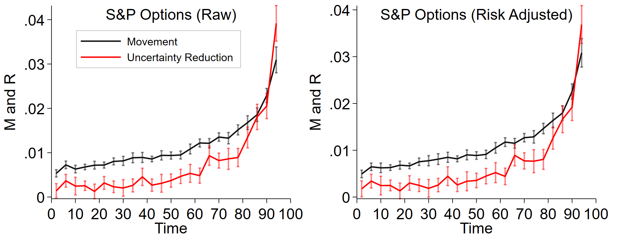 This figure plots how movement and uncertainty reduction vary as a function of time to market resolution. If prices reflected Bayesian beliefs, movement would be exactly equal to uncertainty reduction. Compared to this benchmark, excess movement is consistent with overreaction, and too little movement is consistent with underreaction (Augenblick and Rabin, 2021).Â